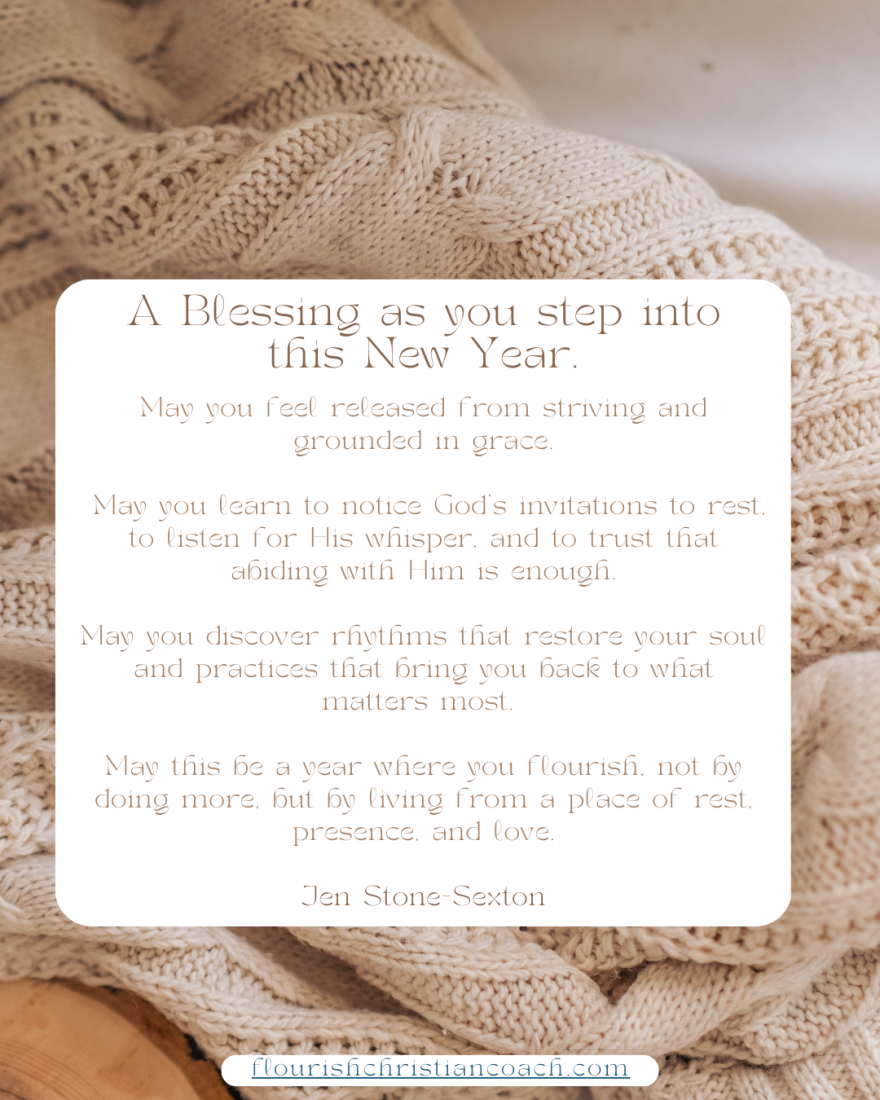 Prayer: "God of rest and renewal, As we enter this new year, quiet our hearts. Release us from the pressure to strive, prove, and perform. Teach us how to abide in You. To receive Your grace, listen for Your whisper, and trust that rest is not a reward, but a gift. Lead us into rhythms that restore and bring us back to life. In Jesus Name, Amen."
